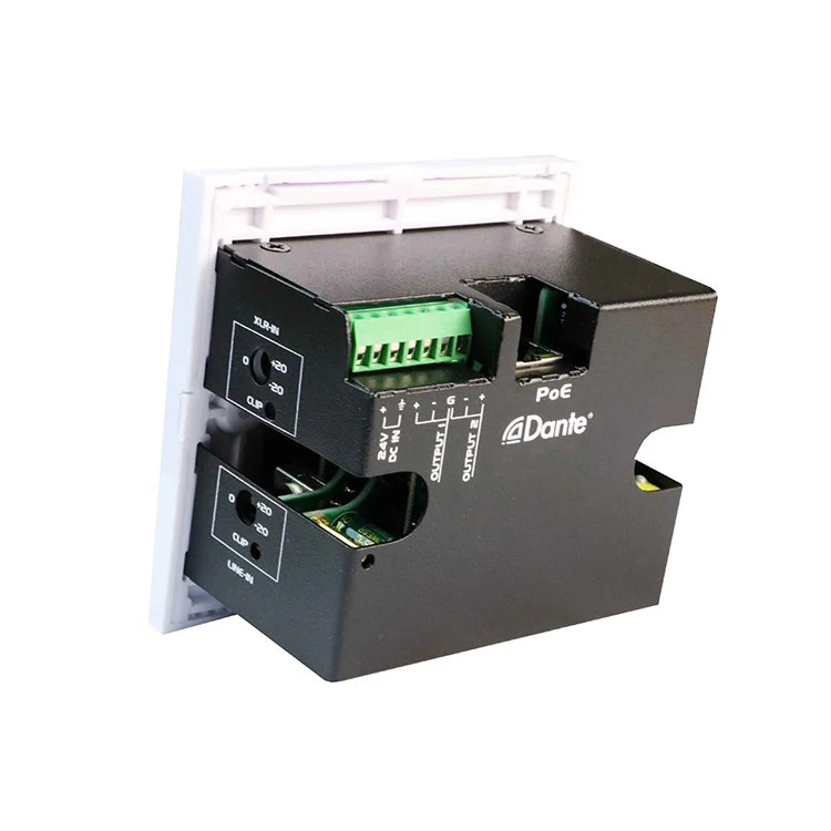 Отзад два изхода на Dante доставят девствено 24-битово аудио в мрежата, докато страничните светодиоди за мониторинг на сигнала/клип статус, мощност и синхронизация. Захранван чрез POE или 24VDC, той включва висококачествен MIC предусилвател за производителност с ниско ниво-IDEAL за студиа, конференции и звук на живо.