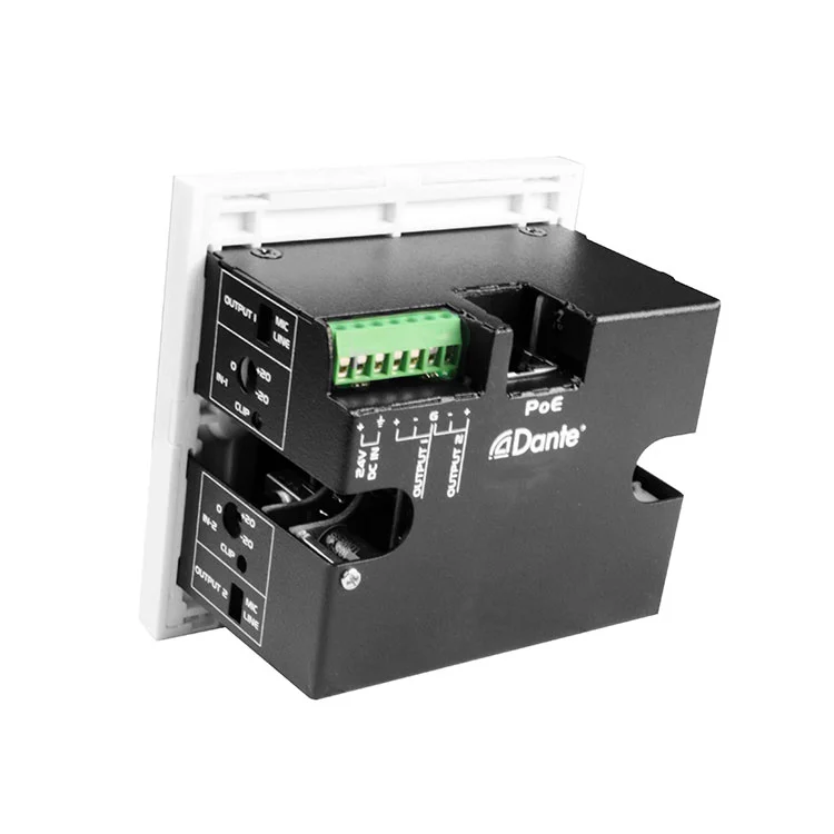 2CH DANTE Interface 2 MIC/LINE Входове X 2 Изходния панел на интерфейса е идеален за професионални аудио приложения, като конферентни зали, настройки на звук на живо, излъчващи студия и инсталирани AV системи, където се изисква надежден данте-аналог и аналогов към Dante преобразуване в компактен, безкраен фактор на формата. Неговият монтиран на стена дизайн позволява чиста и ефективна интеграция в различни среди, като същевременно поддържа висококачествена аудио производителност.